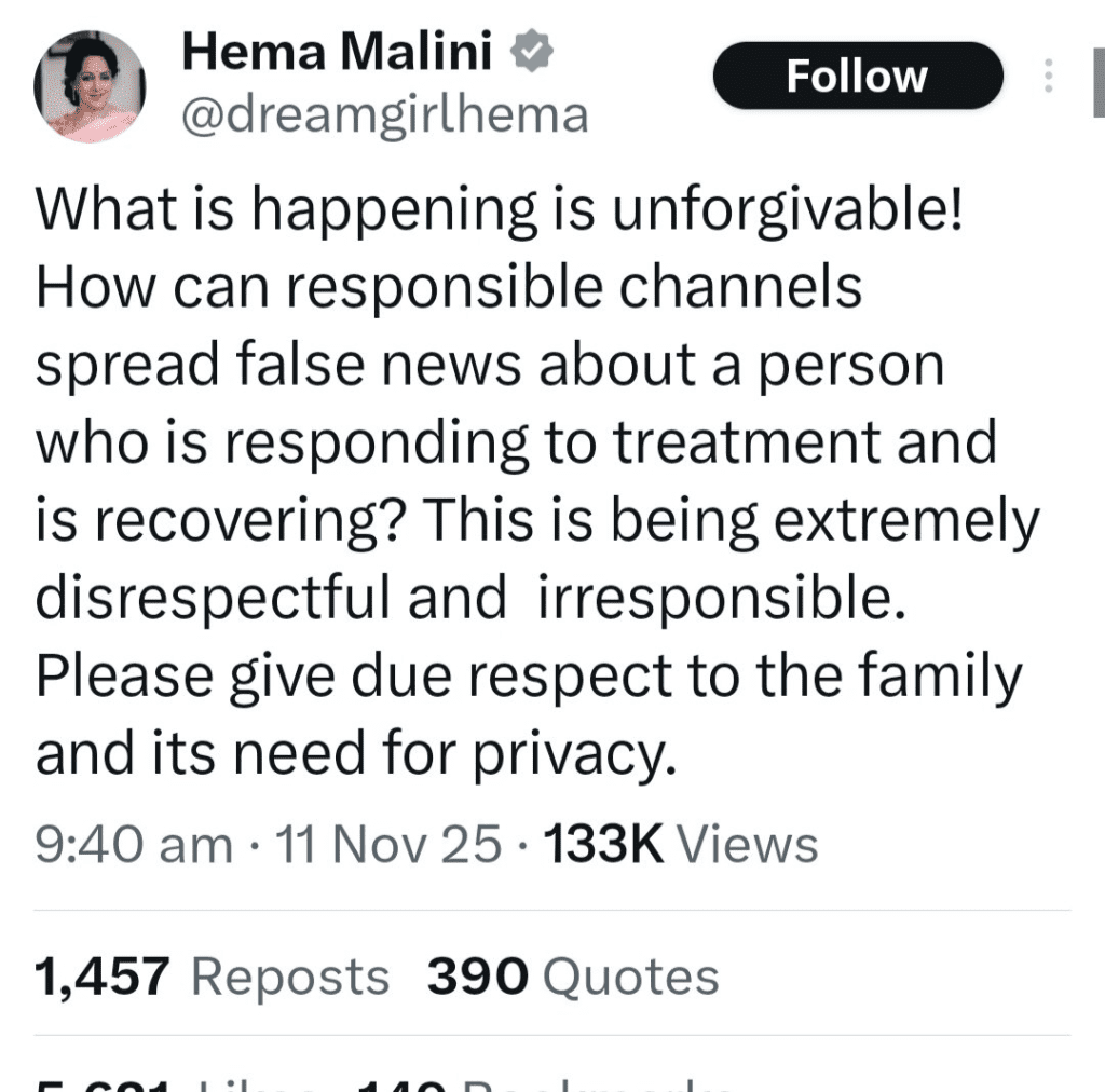 हेमा मालिनीले आफ्नो आधिकारिक एक्स ह्यान्डलबाट हालै गरेको ट्वीटमा लेखेकी छिन्, “जे भइरहेको छ त्यो अक्षम्य छ । जिम्मेवार मिडियाहरुले कसरी एक जना मानिसको बारेमा झूटा खबर फैलाउन सक्छन् जसको उपचार सफल भएको छ र परिणामहरू देखाइरहेका छन् ? यो साँच्चै अनादरपूर्ण र गैरजिम्मेवारपूर्ण छ । कृपया हाम्रो परिवार र हाम्रो गोपनीयताको पूर्ण सम्मान गर्नुहोस् ।”