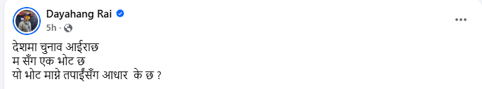बुधबार सामाजिक सञ्जाल फेसबुकमा आफ्नो एउटा तस्बिर सेयर गर्दै दयाहाङले शक्तिमा रहेका र शक्ति खोजिरहेका दलहरूलाई प्रश्न गरेका छन्, ‘देशमा चुनाव आइरहेछ । मसँग एक भोट छ । यो भोट माग्ने तपाईंसँग आधार के छ ?’