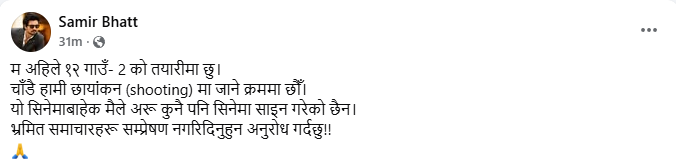उनले लेखेका छन्, ‘म अहिले ‘१२ गाउँ २’ को तयारीमा छु । चाँडै हामी छायांकनमा जाने क्रममा छौँ । यो सिनेमाबाहेक मैले अरू कुनै पनि सिनेमा साइन गरेको छैन । भ्रमित समाचारहरू सम्प्रेषण नगरिदिनुहुन अनुरोध गर्दछु ।’