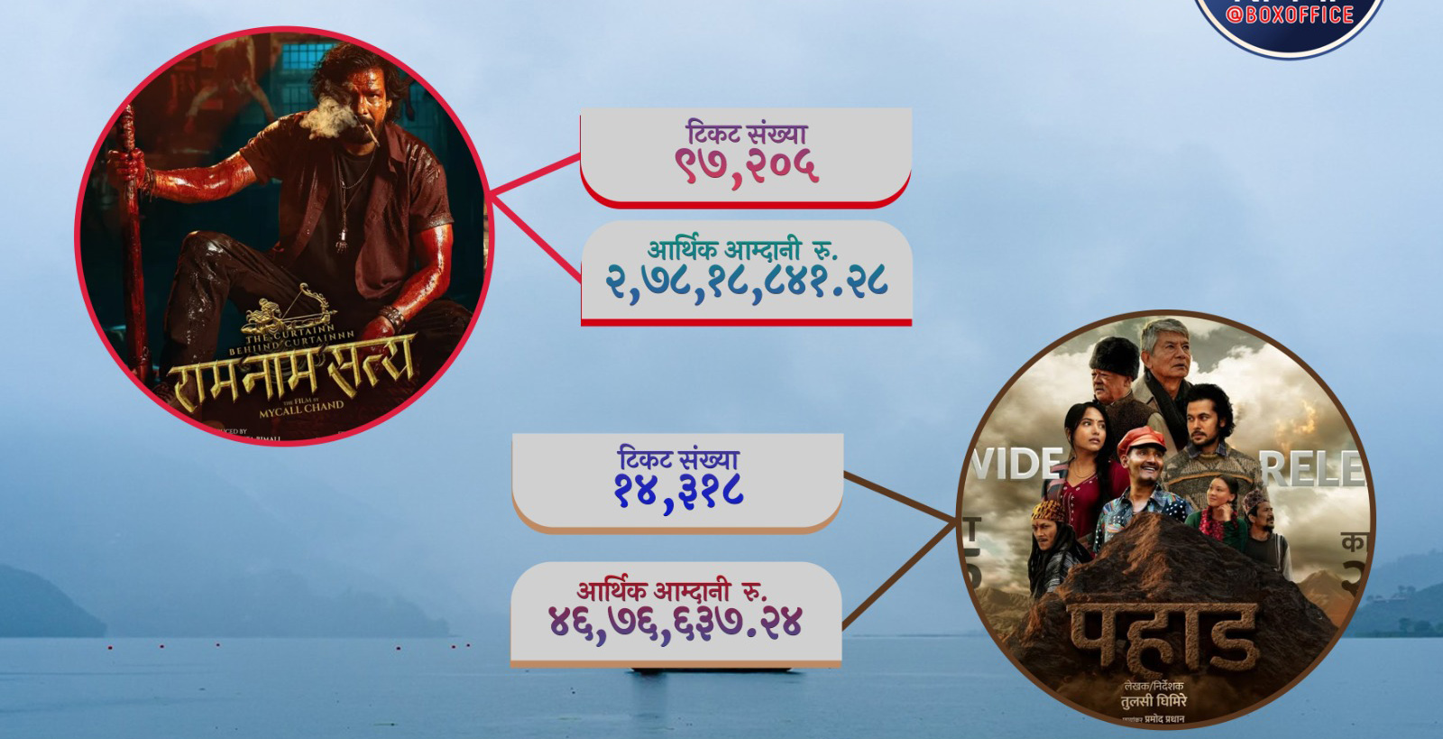 चलचित्र विकास बोर्डले सार्वजनिक गरेको पछिल्लो बक्स अफिस तथ्याङ्क अनुसार विराज भट्ट अभिनित फिल्म ‘राम नाम सत्य’ ले बक्स अफिसमा बलियो पकड जमाउँदा तुलसी घिमिरेको फिल्म ‘पहाड’ को व्यापार भने निकै कमजोर देखिएको छ ।