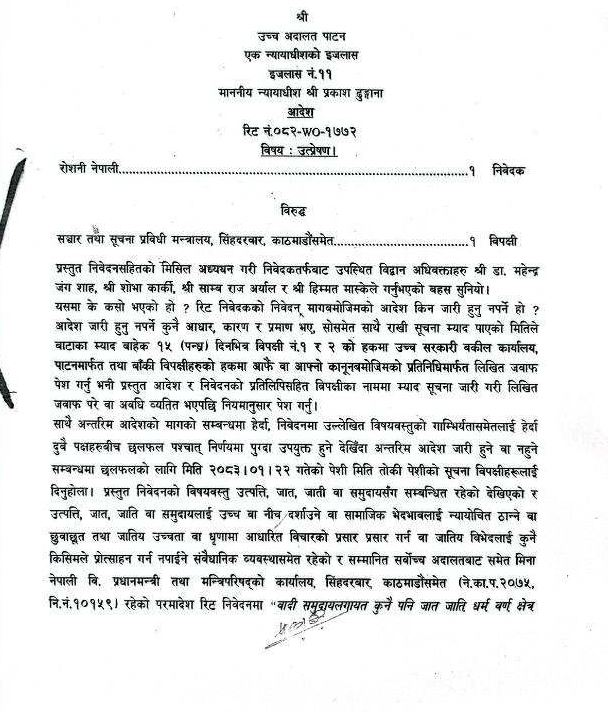 वादी समुदायको तर्फबाट परेको रिटमाथि प्रारम्भिक सुनुवाइ गर्दै न्यायाधीश ढुंगानाको इजलासले विपक्षीहरूलाई १५ दिनभित्र लिखित जवाफ माग गरेको छ ।