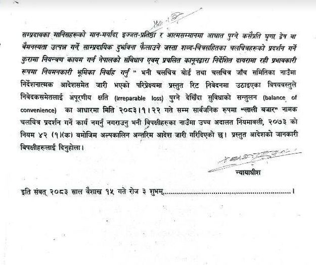 ‘रिट निवेदनमा उठाइएका विषयवस्तुले निवेदक समेतलाई अपूरणीय क्षति पुग्ने देखिँदा सुविधाको सन्तुलनका आधारमा वैशाख २२ गतेसम्म सार्वजनिक रूपमा लालीबजार नामक चलचित्र प्रदर्शन गर्ने कार्य नगर्नु नगराउनु भनी विपक्षीहरूका नाउँमा अल्पकालीन अन्तरिम आदेश जारी गरिदिएको छ,’ उक्त आदेशमा भनिएको छ ।